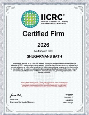 Shugarman’s Bath is certified by the Inspection, Cleaning and Restoration Certification (IICRC) to handle mold. Our installers can safely remove mold found during demolition. That means you won’t be spending thousands more to hire a separate mold remediation company before your remodel can continue.