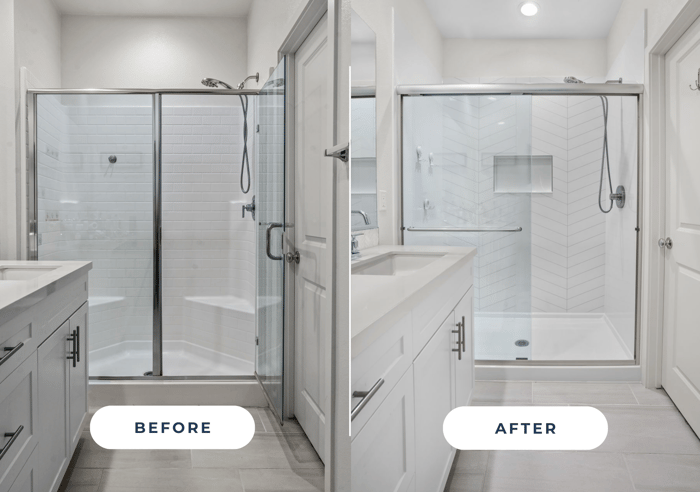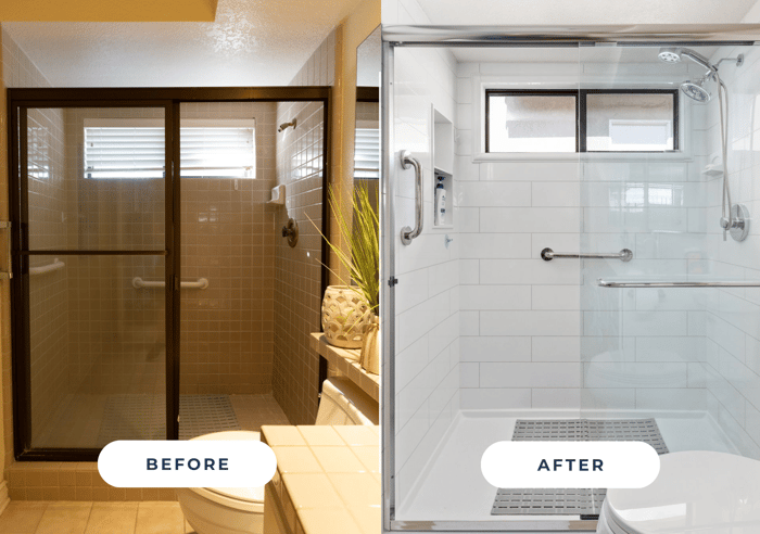 Many older showers have a soffit or boxed-in ceiling area. Removing it raises the visual ceiling and helps the shower feel taller.